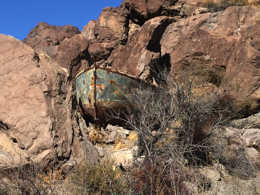 A crashed plane in El Dorado Canyon amongst all the old cars.